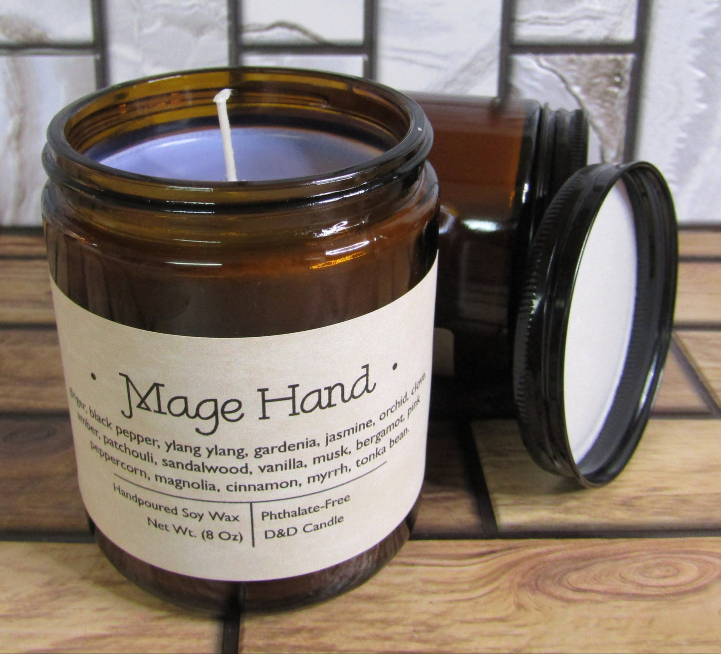 Our 8 oz D&D Spell candles come in a dark amber glass jar. Made with hand-poured soy candle wax and a splash of color, they use the same scents as our soaps: free from things that would be dangerous around your animal companions (other than the flame part!)